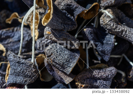 Dried chili peppers hanging in the sun highlighting vibrant textures and deep colors of traditional spice preparation