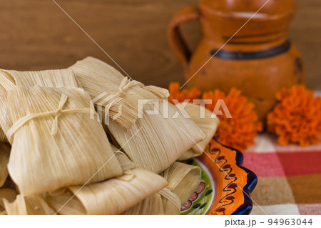 メキシコ料理 タマレスとアトーレとマリーゴールド 死者の日のイメージで
