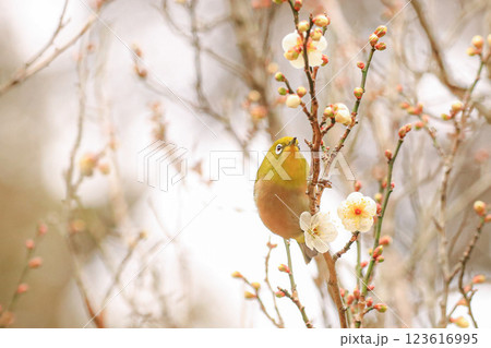 梅、メジロ、春の花