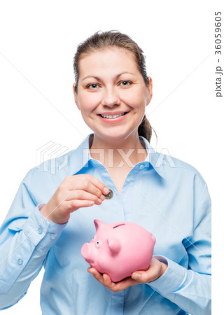 Woman inserts a coin into a piggy bank