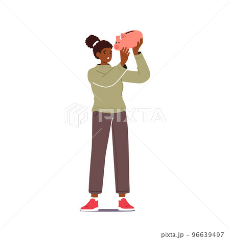 Poor Black Woman Shaking Empty Piggy Bank In Hands Searching Money. African American Female Character Financial Problem