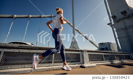 Active woman running on an urban bridge during a sunny day