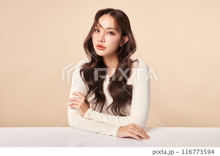 Beautiful young asian woman with clean fresh skin on beige background, Face care, Facial treatment, Cosmetology, beauty and spa, Asian women portrait.