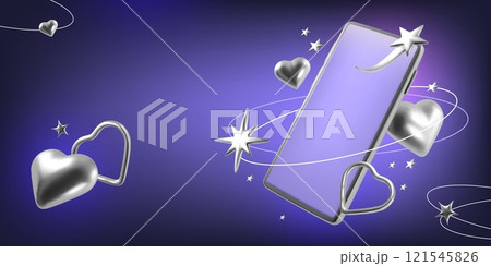 3d smartphone. Silver heart. Chrome star and confetti frame phone for Valentine day. Love glossy shape. Cellphone screen. Sparkling circles. UI display technology. Vector Y2K background