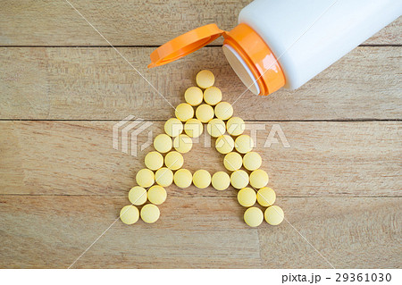 Yellow pills forming shape to A alphabet on wood