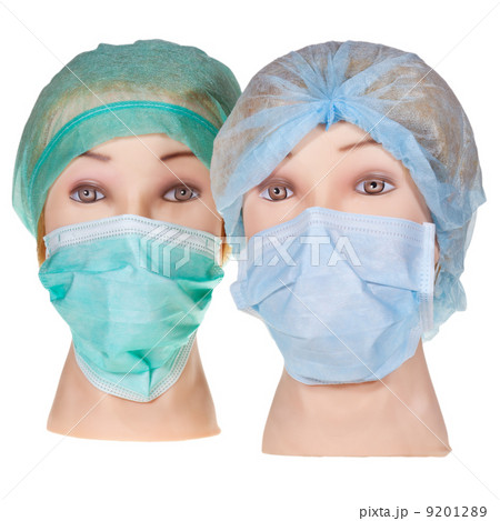 dummy doctor heads wearing textile surgical cap and mask