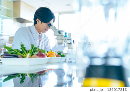 顕微鏡で野菜の成分を観察する若い研究者 管理栄養士