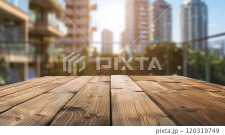 A wooden tabletop sits in front of a blurred city background, sunlight shining through the trees.