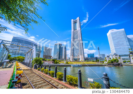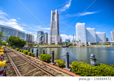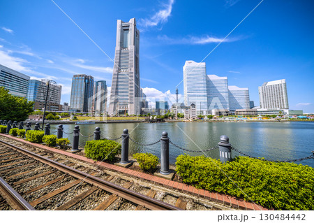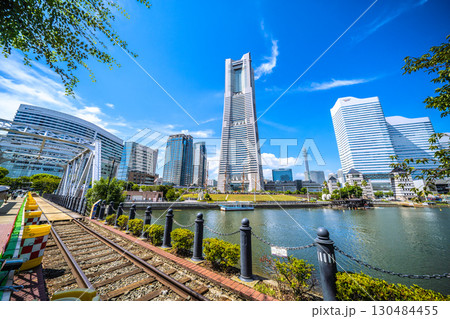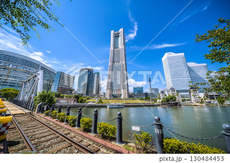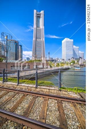 日本の横浜都市景観珍景レールがむき出しに…汽車道から横浜ランドマークタワーや賑わう日本丸…などを望む