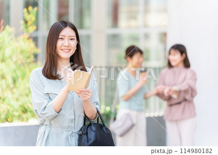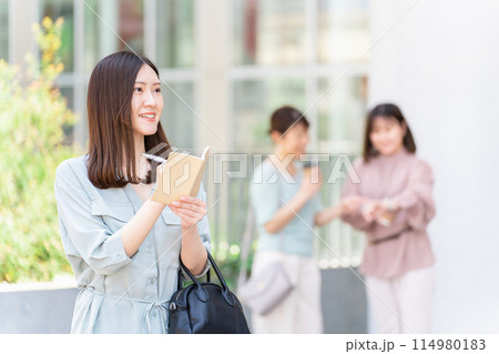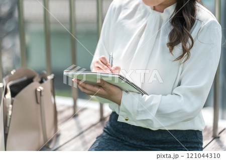 駅・公共施設でメモを取るビジネスウーマン(手帳・記者・メモ魔・スケジュール)