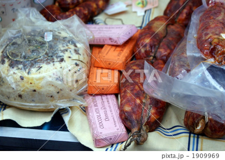 店先につるされるプロシュット イタリア フィレンツェの中央市場『イル・メルカート』にて