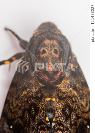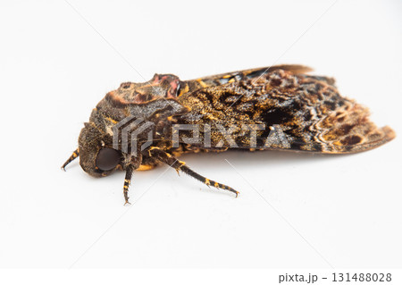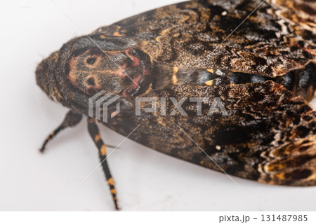 生き物 昆虫 クロメンガタスズメ、不吉なイメージの蛾です。横から見ると髑髏マークは立体的な造形になっています