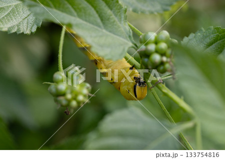 生き物 昆虫 クロメンガタスズメ、成虫は髑髏マークが特徴。幼虫も不気味系ですが、巻いた尻尾がチャームポイント。ヒヨドリジョウゴで食事中