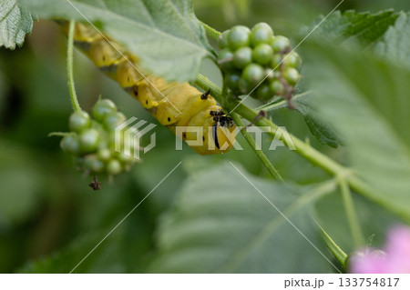 スズメガの幼虫 ナスの葉にしがみ付くメンガタスズメ