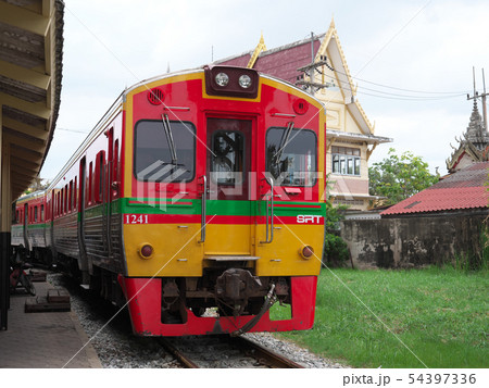 タイ・メークロン駅に停車中の鮮やかな列車 Mae Klong station, Thailand