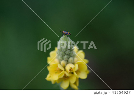 黄色いビロードモウズイカの花にとまったナガメのアップ