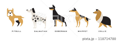 Different Dog Breed Flat Icon and Pictogram with Inscription Vector Set