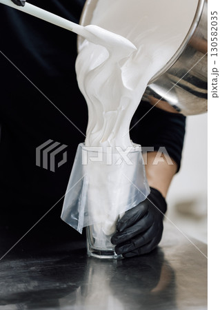 Pouring fluffy meringue into piping bag for pastry preparation in professional kitchen