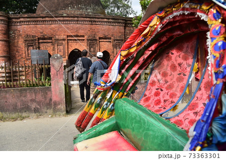 バングラデシュのダッカのショナルガオ 歴史的なゴアルディ・モスジットと停車中のリキシャと観光する男性