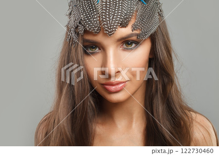 Charming female model with healthy long wavy hairstyle, trendy make-up