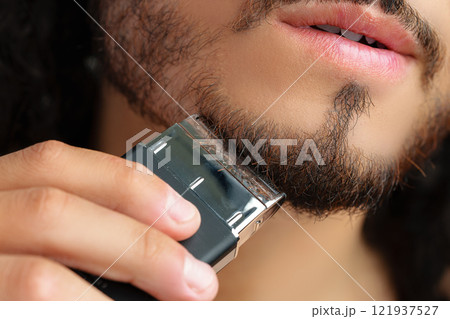 Man trimming his beard indoors using an electric trimmer while showcasing his personal grooming routine