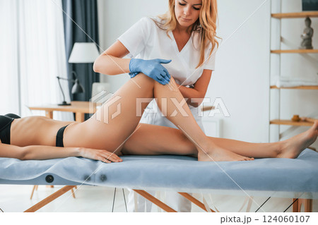 Putting cream on the legs. Woman is having sugaring procedure in the clinic by female doctor