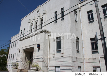 青空に映える白壁が美しい旧尼崎警察署の玄関部を右側から 兵庫県尼崎市