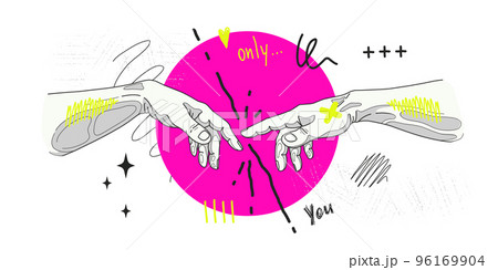 Adam creation, god hand touch. Michelangelo modern art, renaissance calligraphy, man fingers. Contemporary style drawing, bright background. Bible story. Vector abstract design
