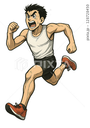 迫力ある表情で走る若者の劇画風イラスト、全力疾走する熱血ランナーの一瞬、気合いを込めて走るトレーニン