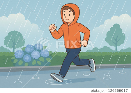 ランニングする若い男性のイラスト、白Tシャツで走る元気な若者、スポーツウェア姿でジョギングする青年