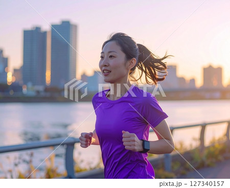 朝日を浴びて川沿いを走る日本人女性1 AI生成画像