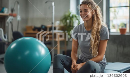 エクササイズ、リハビリ施設での運動療法、バランスボールと女性