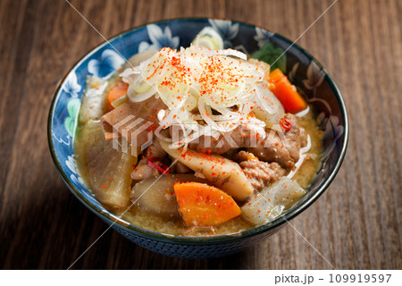 大根、人参、牛蒡、豆腐が入った具だくさんの熱々みそ味もつ煮込み