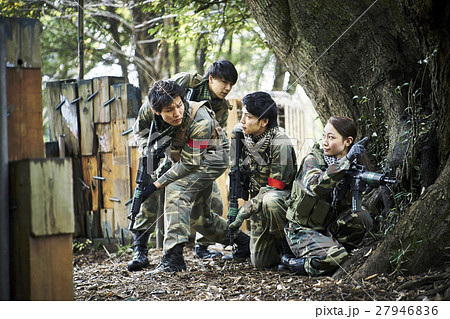 サバイバルゲームをする男女