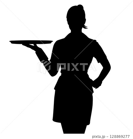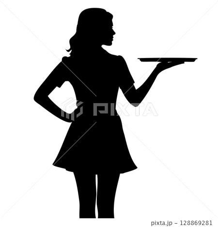 トレーを持つ女性のシルエット - レストラン・ホテルなどサービス業のイメージ グラマーなウエイトレス