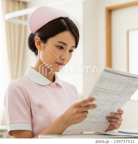 真剣な顔でカルテや書類、検査結果を確認する若い女性看護師