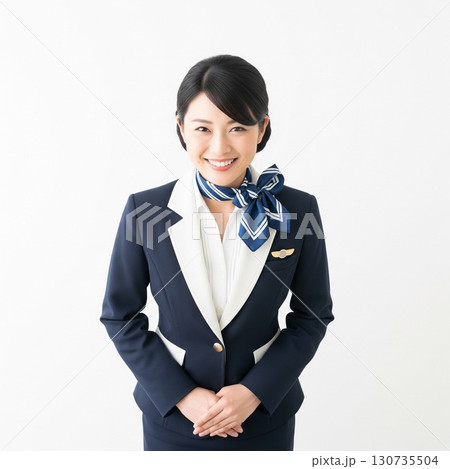 お辞儀をする笑顔の若い客室乗務員 白背景 紺色の制服
