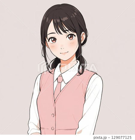 柔らかな笑顔を浮かべるピンクベストの受付女性(白背景)