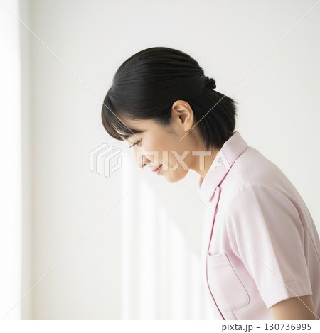 お辞儀をする笑顔の若い看護師の横顔