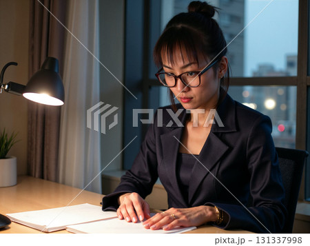夜のデスクで仕事をするビジネスウーマン