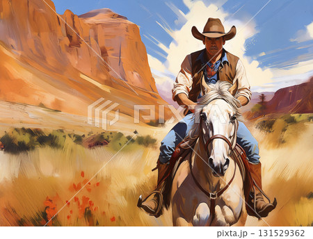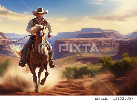 アメリカの西部劇風の風景と馬に乗るカウボーイ