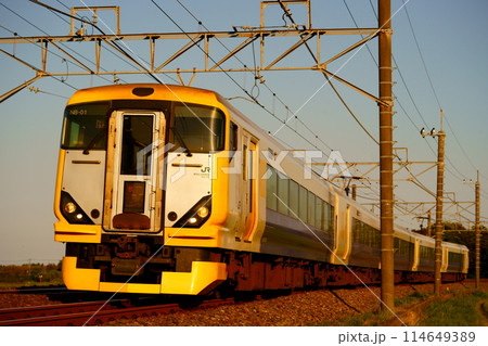 初夏の夕方の外房線:特急新宿わかしおの美しい鉄道風景