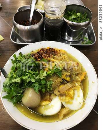 Mohinga or Burmese Fish Noodle Soup in white plate on marble table top