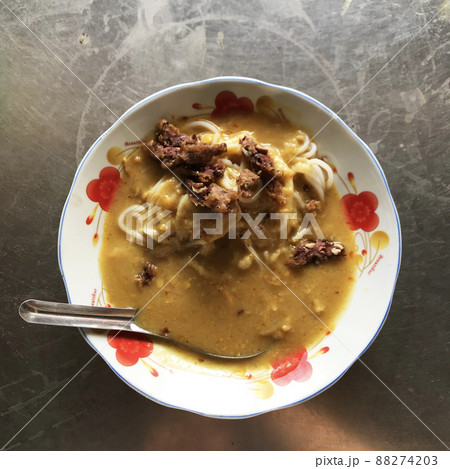 Mohinga is a fish soup prepared with rice noodles and flavored with lemongrass which is considered as the national dish in Burma closeup in the bowl. Horizontal top view