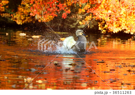 紅葉の水面で羽ばたくカルガモ