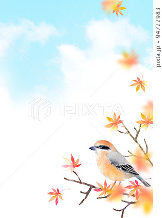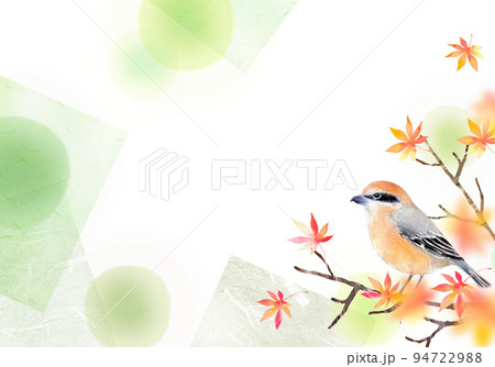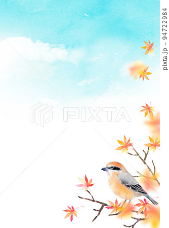 紅葉とモズ 背景素材 水彩イラスト