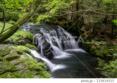 清流に流れる初夏の青紅葉が美しい新緑と滝の風景