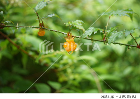 自然 植物 カジイチゴ、オレンジ色の艶々の実。四月初めに花が咲いて五月半ばには食べられます
