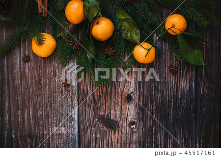 Christmas background with Mandarins, fir branches, cinnamon and star anise. Decorative festive