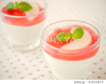 桃のムース ピーチメルバソースかけ 水玉背景 ペアバージョン (ハイアングル)